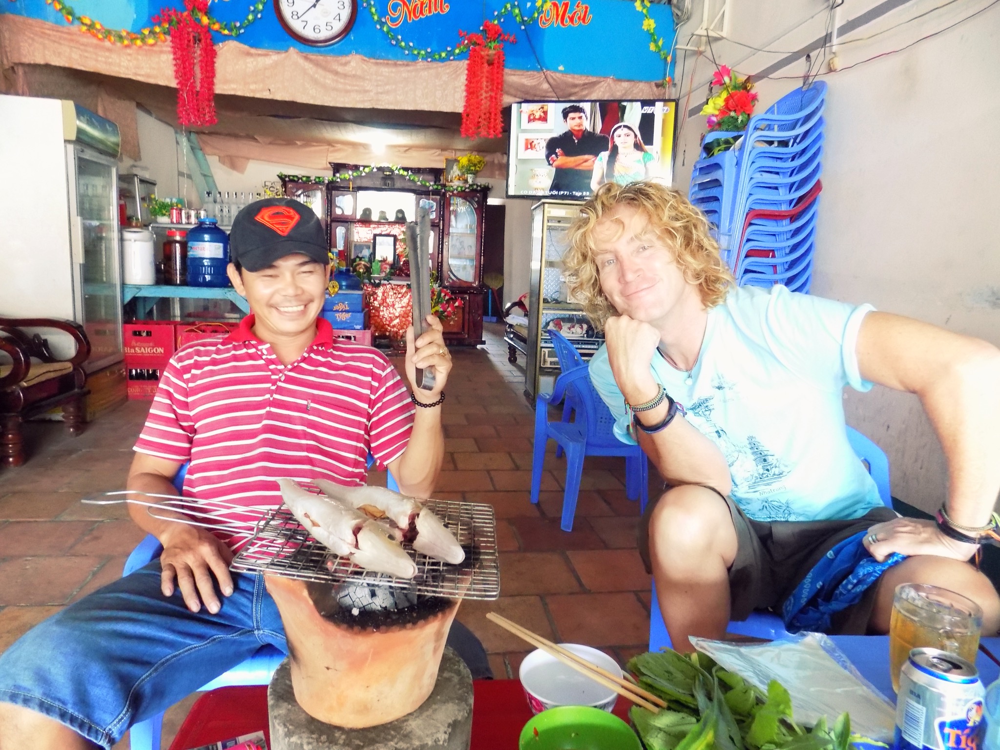 imageWe stopped for lunch at a local village, or rather, the only other village!  Our hosts were so polite and engaging, that we thought it churlish to refuse their fishy offering.  The ‘head chef’ sat with us and prepared the frightful feast.  He seemed to take a shine to me, and I was therefore offered all the best bits of this marine meal.  First, he fed me a fish eye, which glared at me angrily before he chopsticked it into my gob.  Then, I sampled some gill and something quite unrecognisable that came from the fish’s midrift.  Finally, with a flourish, I was presented with a type of organ, which flapped between the sticks before it slithered down my gullet.  It was most unappealing.
