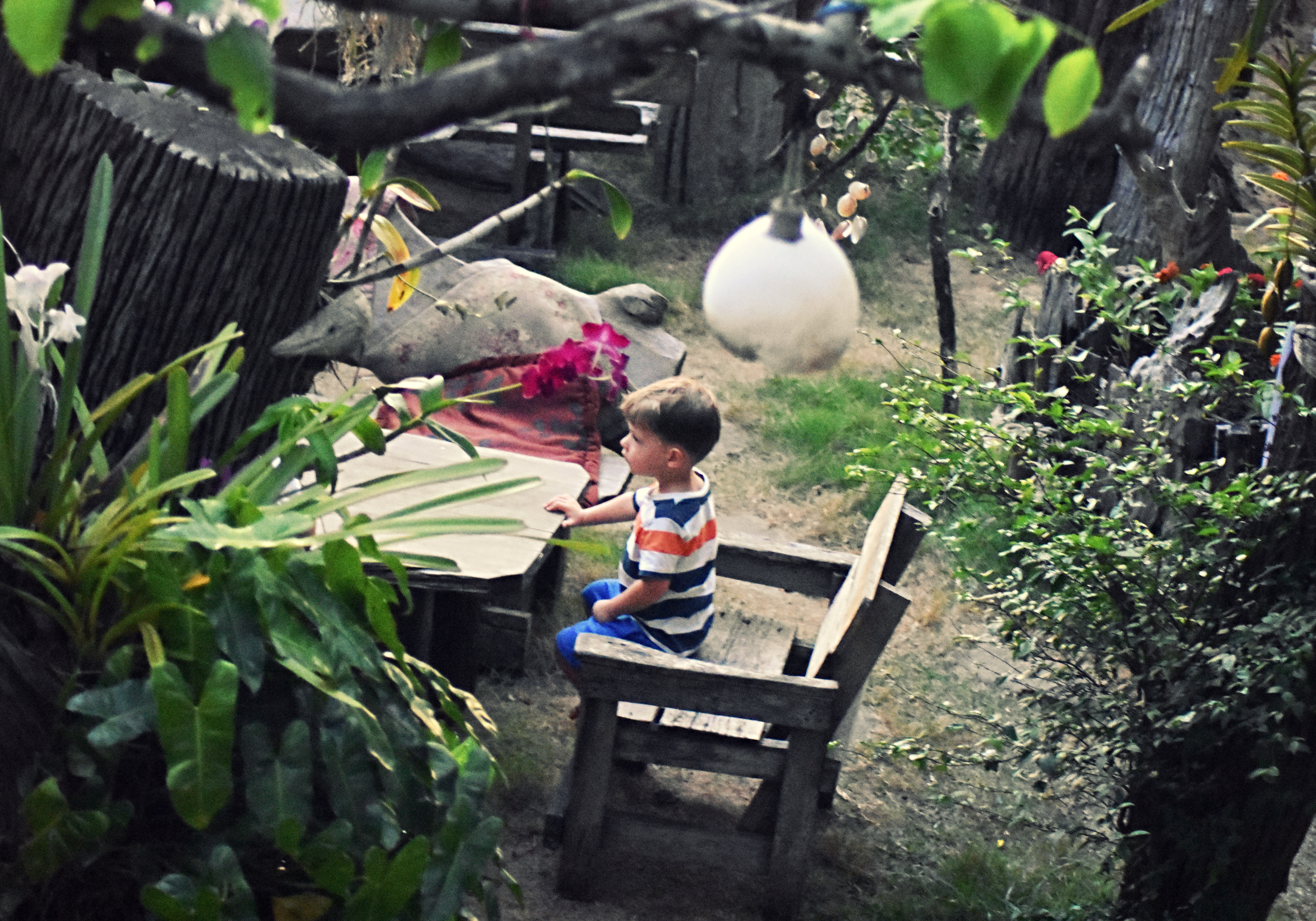 Two eateries nested within it’s twisted form. One serving traditional Thai, the other branching out into more Western fare – Cheeseburgers and Banana Pancakes. Paul was not surprised by the one which did the fastest business. There was Heinz ketchup after all!  And the clever folk of this magnificent tree-house on Crocodile Beach had twigged on.