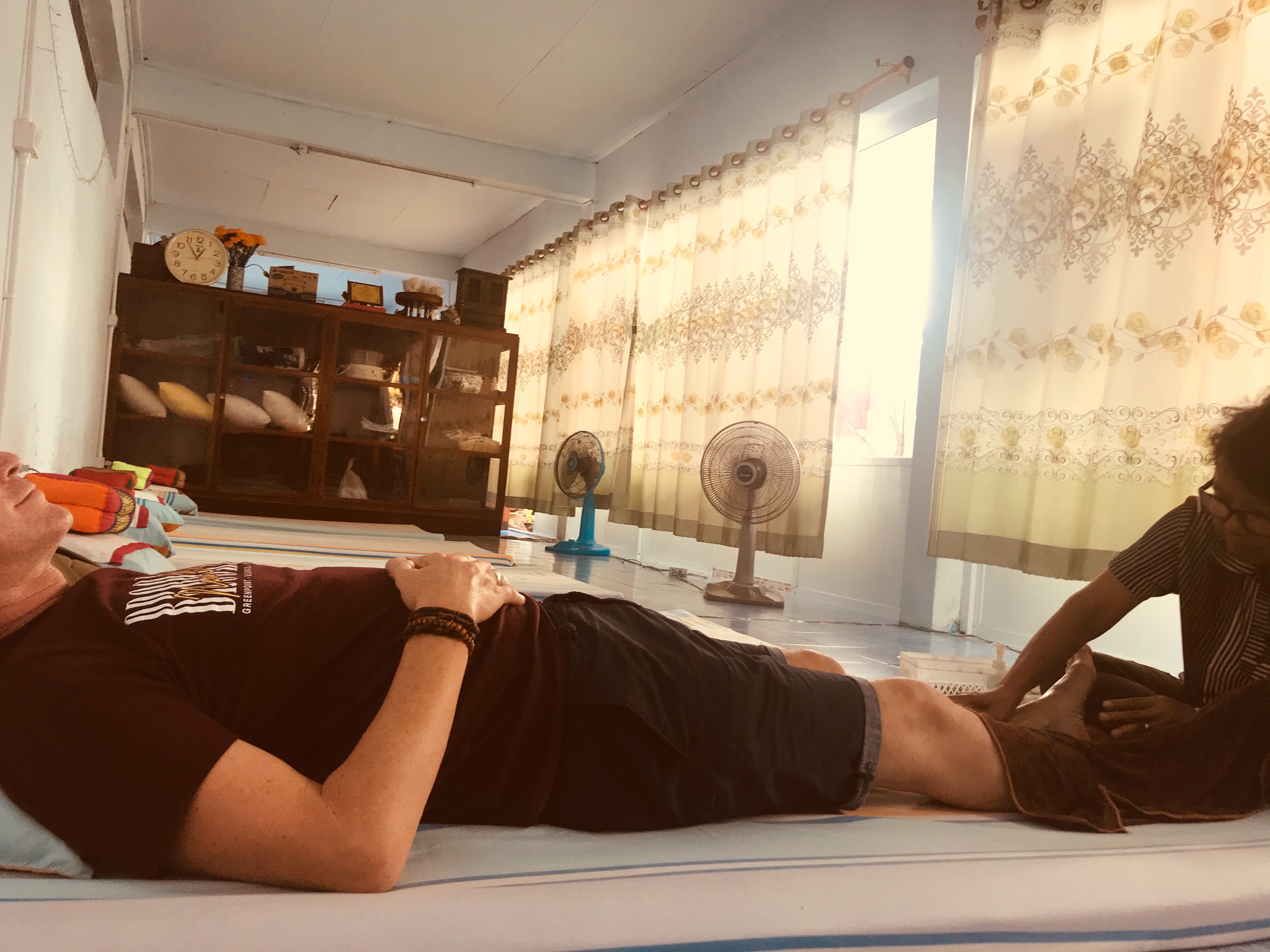 As the old lady with exceptionally strong hands kneaded his lower back his bowels woke. He held on for dear life as she then turned him over, parted his legs and began on his thighs.