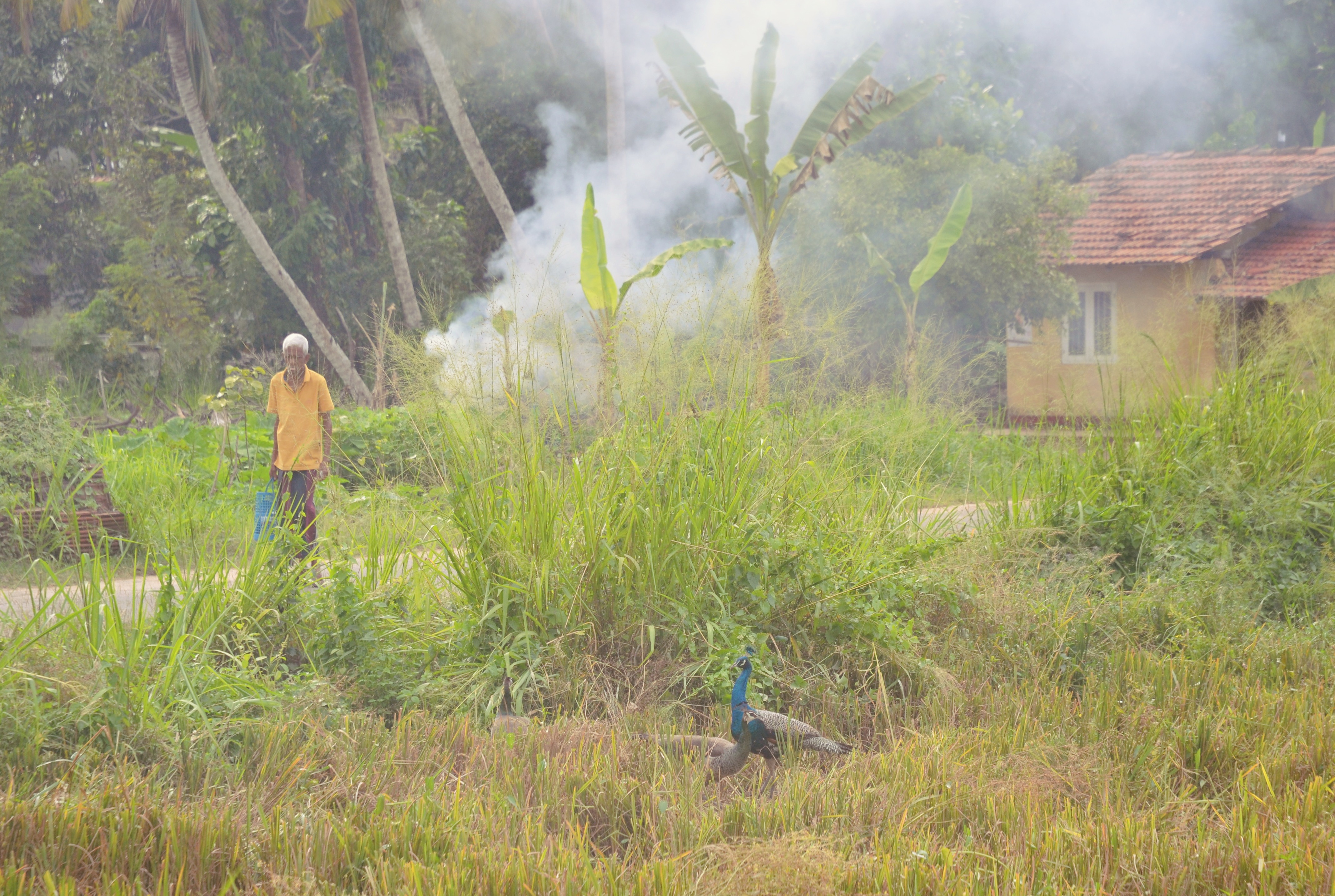 Their small room with just a rickety fan looked out across a paddy field through which peacocks fluttered clumsily, blue avian flashes mid the verdant rice crop.